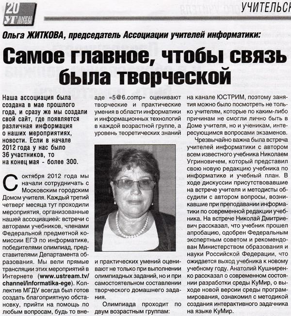 VII олимпиаду для 5-х классов ассоциация проводила в дистанционном режиме 14 мая 2012 года. Количество зарегистрированных участников 578, участников олимпиады — 413. 57 участников олимпиады были отмечены в различных номинациях, награждены грамотами ассоциации, МИОО, МГТУ МИРЭА. Ассоциация организовала встречу с Юрием Горвицем, который рассказал о международном конкурсе ThinkQuest competition 2012, который проводит корпорация Огасlе. В Москве проводится большая работа по повышению квалификации учителей и в МИОО, и в МГУ, и в Бауманке. Наша ассоциация особое внимание уделила в прошлом году повышению квалификации учителей для помощи ученикам при сдаче ЕГЭ и ГИА, организовала занятия в Доме учителя. Совместно с лабораторией информатики МИОО мы провели встречи с Михаилом Ройтбергом — председателем Федеральной предметной комиссии ЕГЭ по информатике, которые были посвящены единому государственному экзамену-2012. У нас выступали Елена Андреева (разбор задании А2 и А4 предстоящего ЕГЭ по информатике) и Денис Кириенко (задание С1). Все встречи напрямую транслируются в Интернете на канале ЮСТРИМ, поэтому занятия можно было посмотреть не только учителям, которые по каким-либо причинам не смогли лично быть в Доме учителя, но и ученикам, интересующимся вопросами экзаменов. Чрезвычайно важна была встреча учителей информатики с автором всем известного учебника Николаем Угриновичем, который представил свою новую редакцию учебника по информатике и учебный план. В ходе дискуссии присутствовавшие на встрече учителя и методисты обсудили с автором вопросы, возникавшие при преподавании информатики по современной редакции учебника. На встрече Николай Дмитриевич рассказал, что учебник прошел апробацию, одобрен Федеральным экспертным советом и рекомендован Министерством образования и науки Российской Федерации, что ожидается выход учебника к новому учебному году. Анатолий Кушниренко рассказал о современном состоянии разработки среды КуМир, о выходе новой версии среды программирования, ознакомил с методикой создания интерактивного задачника на языке КуМир. Каждому учителю мы предоставляем площадку «Поделись своим опытом». В прошлом учебном году опытом делились Олег Голубев («Как организовать школьное радио и телевидение? Основные проблемы, методика работы и решение технических проблем»), Ольга Сливина («Метод проектов в международной школе»), Владимир Шереметьев («Работа с проектами»). Наша ассоциация сотрудничает с Московским центром качества образования. 5 наших педагогов, члены ассоциации, проводили экспертную оценку материалов центра. Центр педагогического мастерства нашел возможность разместить на своем сайте информацию об итогах работы нашей ассоциации по проведению олимпиад и информацию о встречах по повышению квалификации, оказал нам квалифицированную помощь по проведению олимпиад и конкурсов. Мы встречались с первым заместителем руководителя Департамента образования Вениамином Кагановым и говорили о «Внедрении информационных технологий в образование», с заместителем начальника Управления комплексного анализа и стратегического развития системы образования Департамента образования Александром Добряковым, который отвечал на вопросы учителей по поставкам техники и комплектованию школ оборудованием. Когда создавалась наша ассо